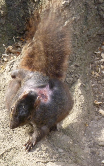 Finally one squirrel, in a daring display of derring-do, dive-bombed into the lower hole on the right, and immediately exited out of the upper hole on the left, in one smooth move as only a squirrel could do it! Sorry, didn't manage to catch that on camera :)