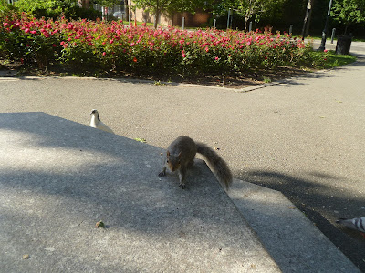 postscript: once the bleeding had stopped and I got home and washed my finger (and doused it with hydrogen peroxide) it didn't look so bad -- no swelling or redness that would indicate infection. So no harm done and maybe I even got lucky -- maybe the squirrel could have taken off my finger! We should also note that squirrels in New York City have been given a clean bill of health: they do not carry rabies or other diseases that could be transmitted to humans. There was no need to go to the ER
