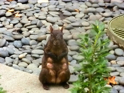 Cute, huh? I've noticed that squirrels seem to enjoy watching sports. I've often observed that when people are playing ball on the green at PCV there is at least one squirrel in attendance, watching the game with curiosity. What squirrels do not like is loud noise. When workers are around making noise with their equipment it drives the squirrels up a tree.